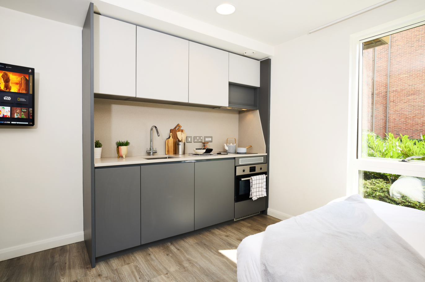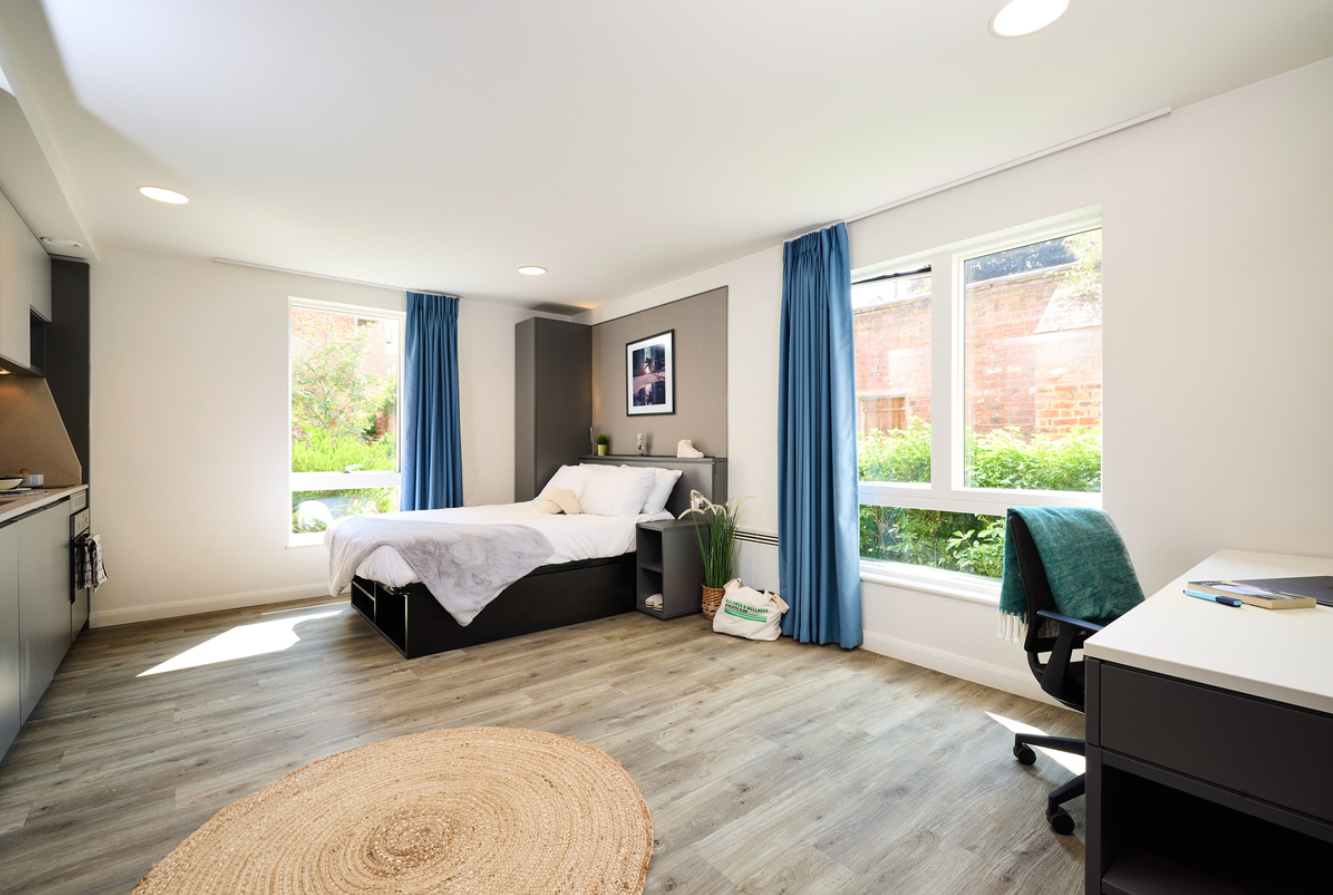 公寓是约克市中心的一个大型社区,坐落在景色迷人的园景花园内,绿化占地25,00平方米,面积等同于三个足球场。有16栋公寓楼,以及1栋供学生休闲放松的公用楼。公寓共有644个床位,其中12幢公寓楼设有312个不同的单间,其中独立单间(studio)288个,面积为18.5㎡~25.5㎡;双人单床间(double studio)19个,面积为25.5㎡~30㎡;双人双床间(twin studio)1个