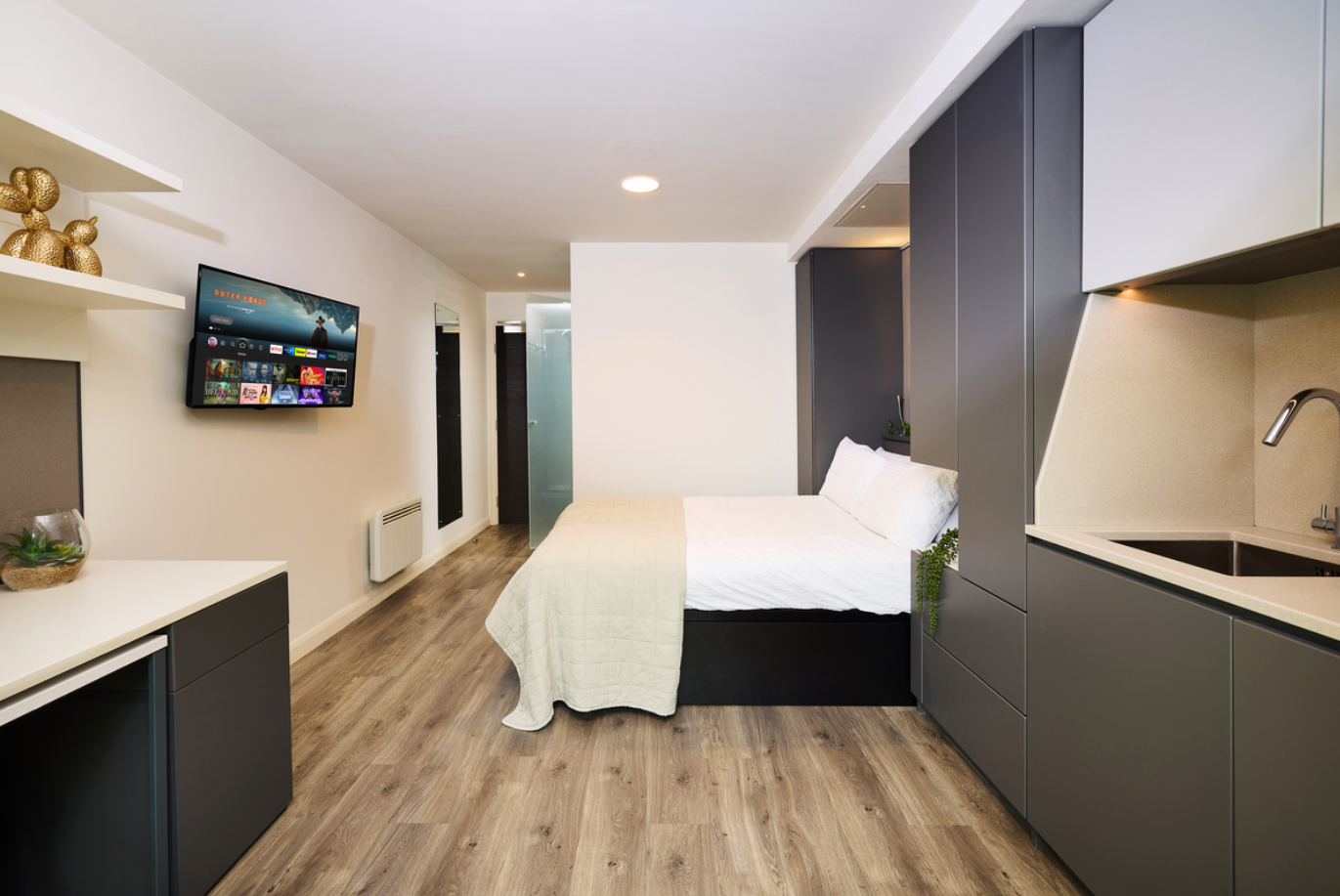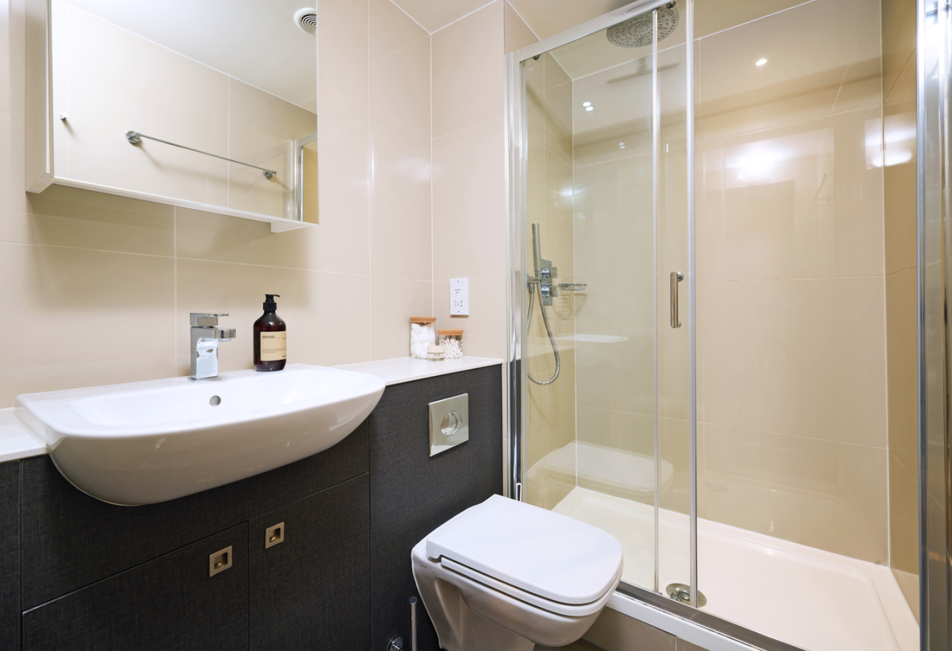 “En-suite”房型一般指带有独立卫浴的单人房间,且厨房和客厅设施需与多人共享。一张床住一人。