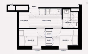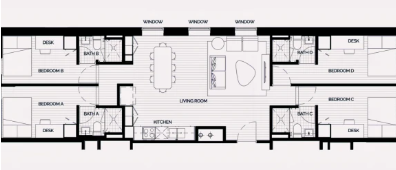 多人卧室指可以入住两人及以上的卧室,住客共享自己的休息和学习空间。卫浴一般是公共卫浴,厨房和客厅设施需多人共享。