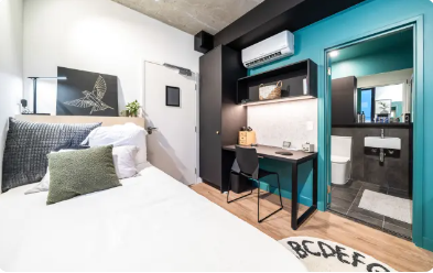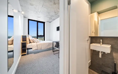 “En-suite”房型一般指带有独立卫浴的单人房间,且厨房和客厅设施需与多人共享。一张床住一人。