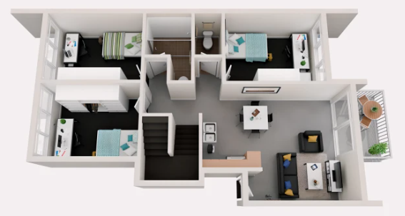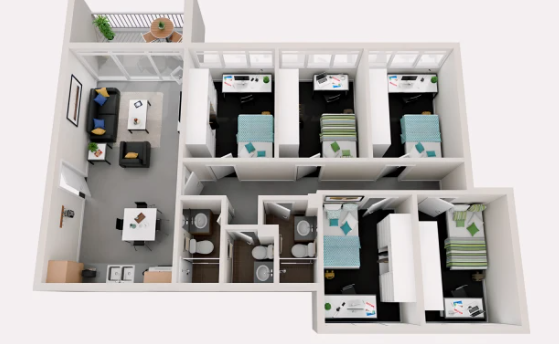 多人卧室指可以入住两人及以上的卧室,住客共享自己的休息和学习空间。卫浴一般是公共卫浴,厨房和客厅设施需多人共享。