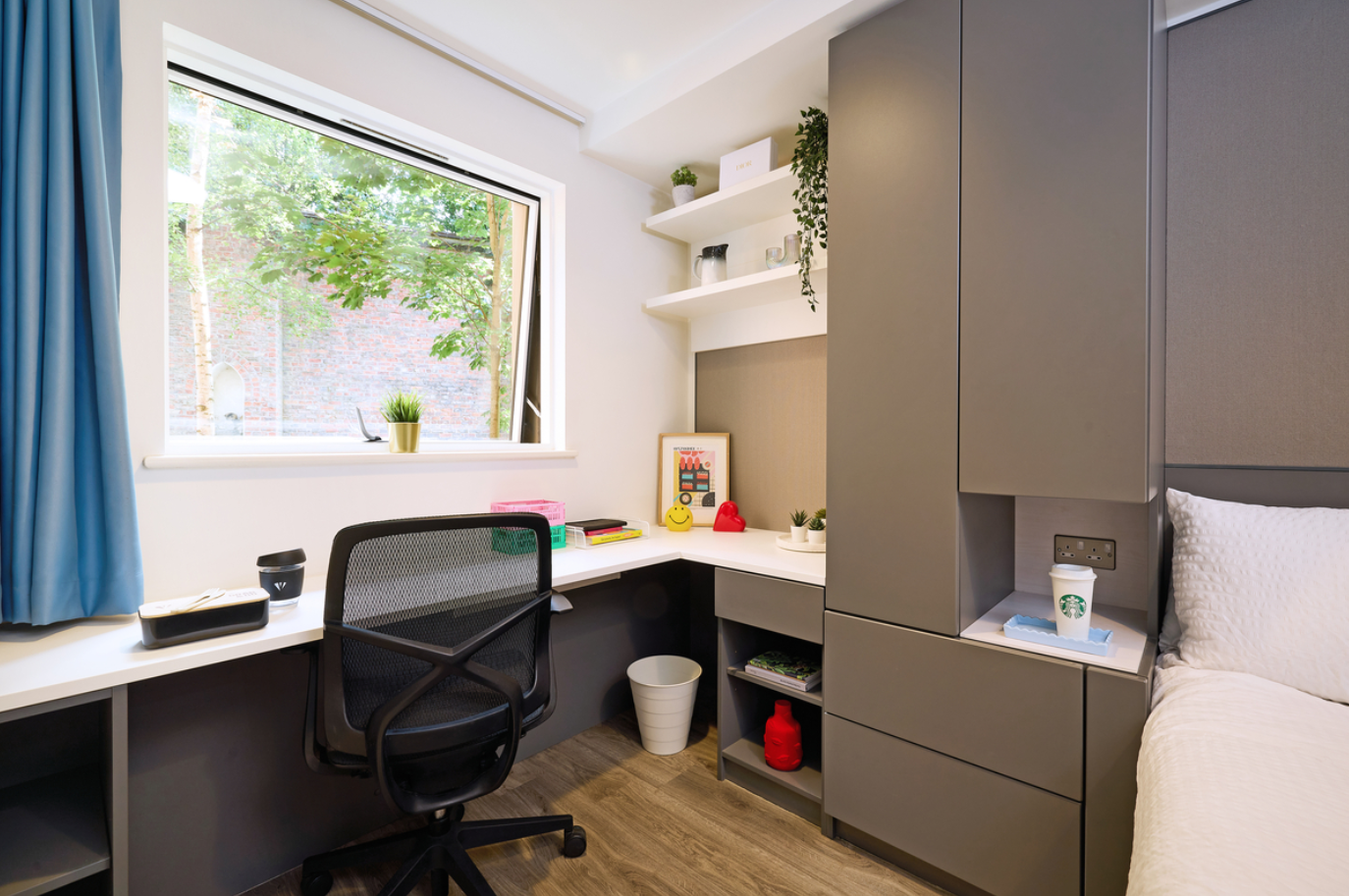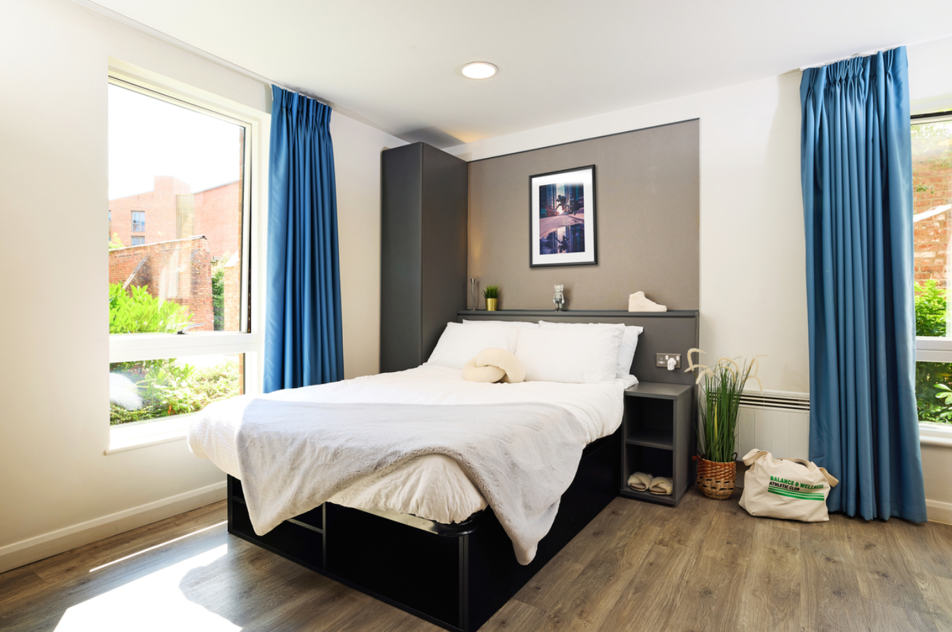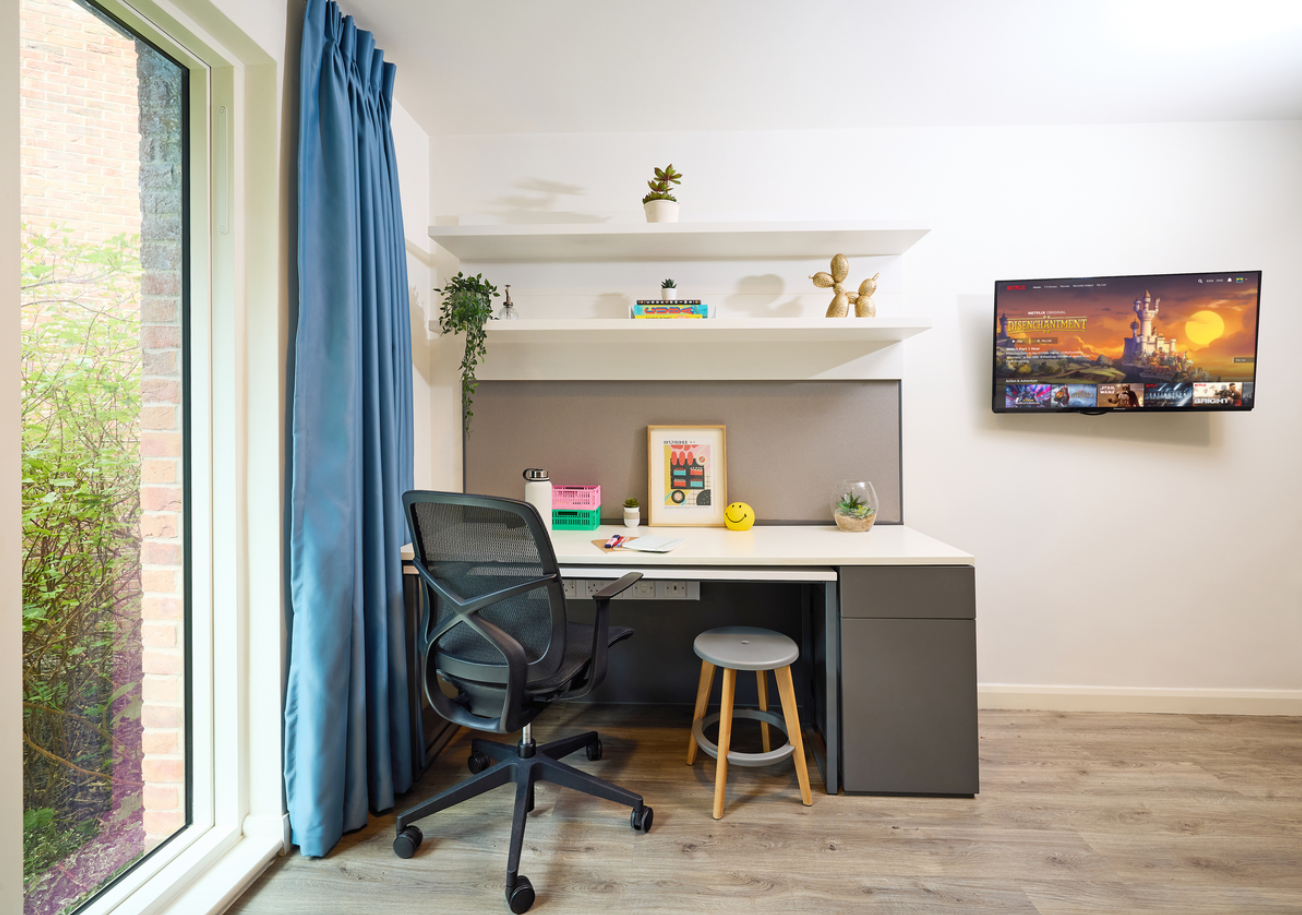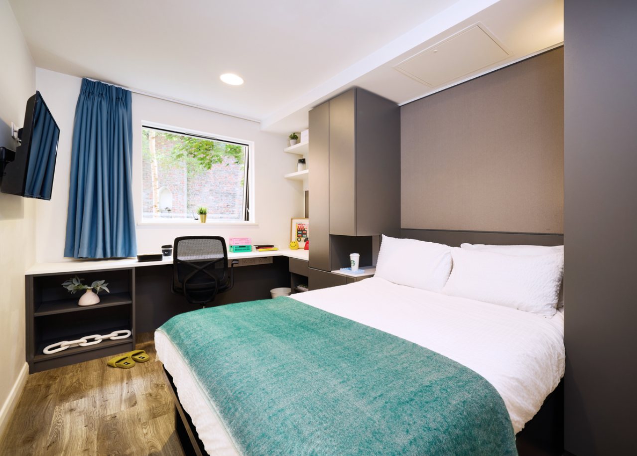 公寓是约克市中心的一个大型社区,坐落在景色迷人的园景花园内,绿化占地25,00平方米,面积等同于三个足球场。有16栋公寓楼,以及1栋供学生休闲放松的公用楼。公寓共有644个床位,其中12幢公寓楼设有312个不同的单间,其中独立单间(studio)288个,面积为18.5㎡~25.5㎡;双人单床间(double studio)19个,面积为25.5㎡~30㎡;双人双床间(twin studio)1个