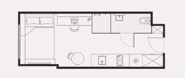 “En-suite”房型一般指带有独立卫浴的单人房间,且厨房和客厅设施需与多人共享。一张床住一人。