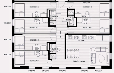 多人卧室指可以入住两人及以上的卧室,住客共享自己的休息和学习空间。卫浴一般是公共卫浴,厨房和客厅设施需多人共享。