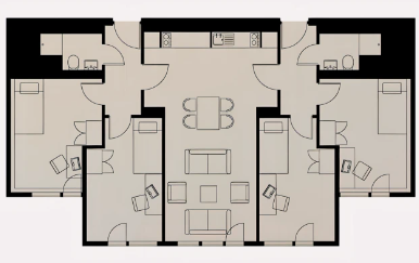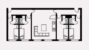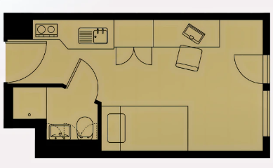 “En-suite”房型一般指带有独立卫浴的单人房间,且厨房和客厅设施需与多人共享。一张床住一人。
